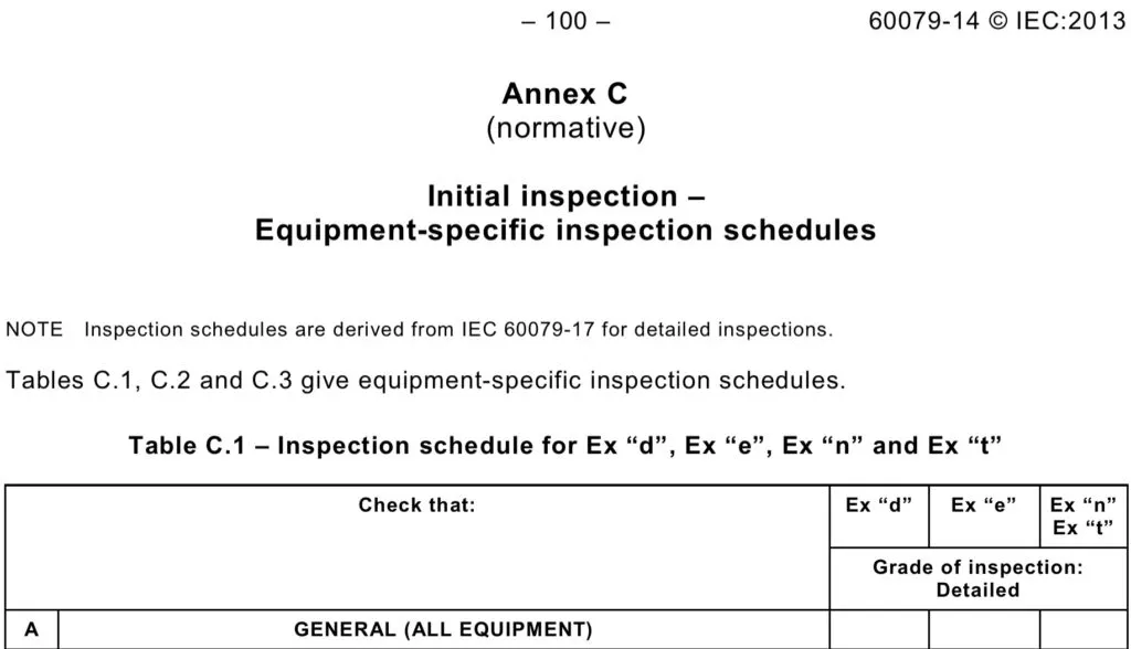 IEC 60079-14/-17 only address the electrical assets and define a checklist for visual, close and detailed inspections. The same for non.electrical Ex does not exist and not even defined in any standard (in EU the ATEX 137 only defines the ignition source assessment). The ISO 80079-36/-36 only address the manufacturing of the same asset, not their application. EN 1127-1 speaks about non.electrical in general as a possible ignition source, so this is very good indication.
