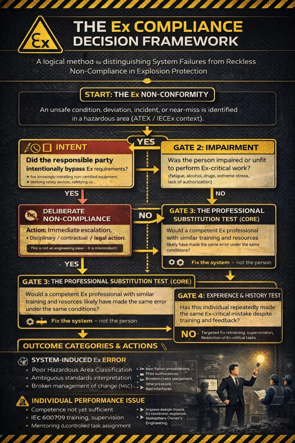 If YES – SYSTEM-INDUCED Ex ERROR (Unclear standards, poor drawings, missing zoning data, conflicting instructions, time pressure, bad interfaces) – Action: Fix the system — not the person