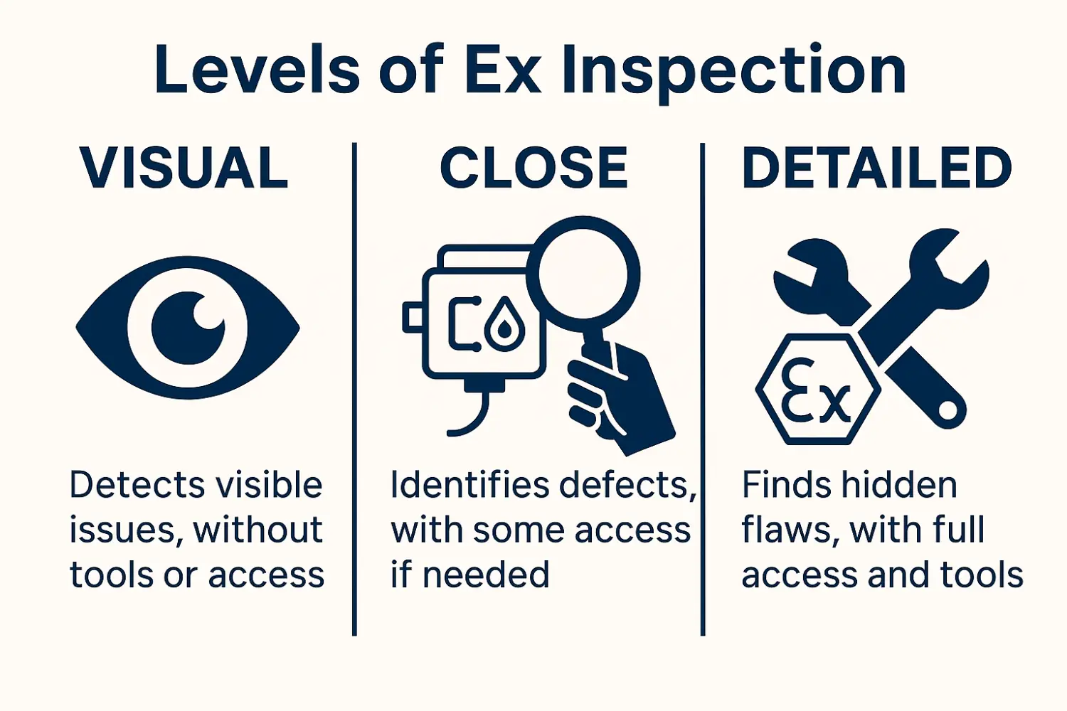 Non-electrical Ex equipment (covered by IEC 80079-36/-37 for construction and marking, ISO/IEC 80079-38 for mining, etc.) still requires inspection — though the standards do not explicitly classify them into visual/close/detailed levels in the same way.