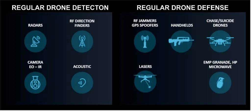 there are many limitations here from both sides. because of large drone technical specification, different detection and defense methods has advantages and disadvantages. according to the detection method, there are blind spots, weather, and drone technology dependent drone detection distance and accuracy, different sensor fusion methods (visual, IR, RF, etc.), what could lead to slow reaction time, operation skill dependency, high collateral damage on defense mode, easy to outnumber, and so on. all of them need to mix for a close to effective protection, that makes it very difficult to operate.
