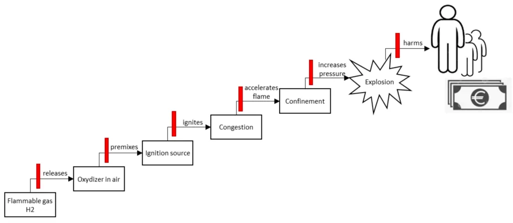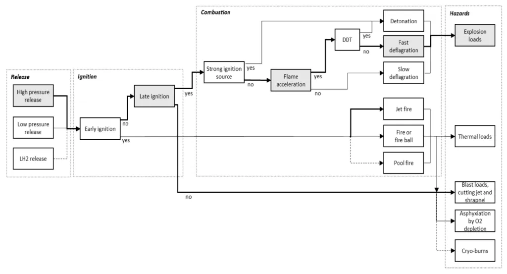 Any hydrogen accident is initiated by a release of hydrogen from a container or pipe which are typically operated at pressures above atmospheric pressure. Sub-atmospheric operation pressures have to be avoided to exclude air ingression. The potential consequences of a hydrogen release are detailed in the event tree shown below.