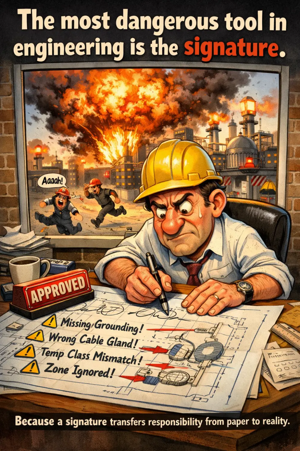 All above might vary from country to country. On the other hand we all experience the power of signature on hazardous area classifications, Ex certificates, Ex inspections, or even on exposion protection document.